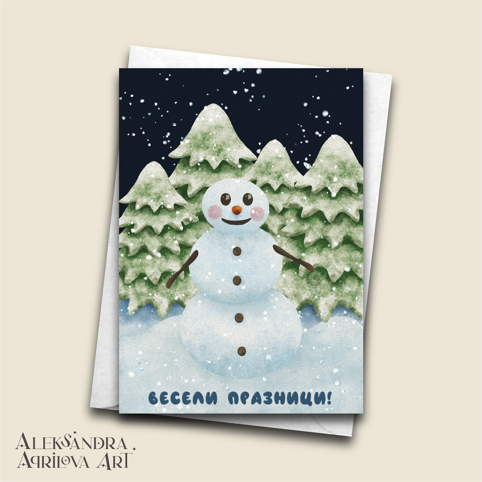 Тази празнична картичка със снежен човек е дигитално нарисувана в мек, акварелен стил, който носи усещане за спокойна зимна приказка. Усмихнатият снежен човек с розови бузки приветства празниците сред заснежени елхи и нежен падащ сняг — като кадър от детски спомен, в който студът е мил, а зимата е уютна.